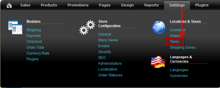 - Отворете административния панел на Summer Cart, менюто Настройки -> Данъци