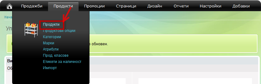 - Отидете на меню Продукти и кликнете върху линка продукти: