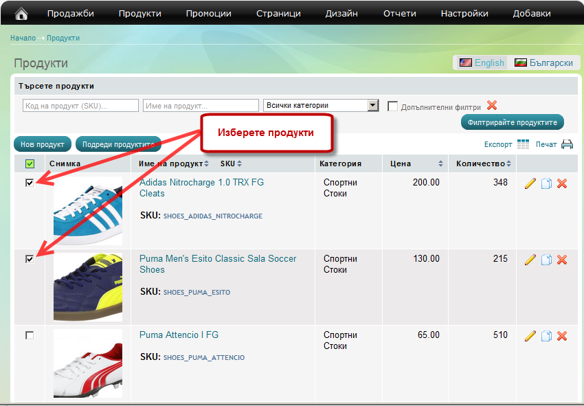 Отидете на меню Продукти и кликнете върху линка продукти: Изберете продуктите, които искате да редак...