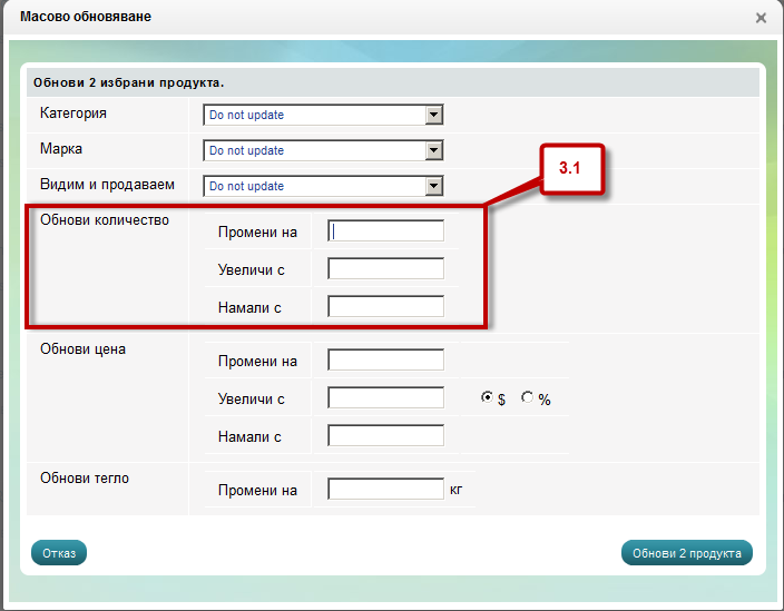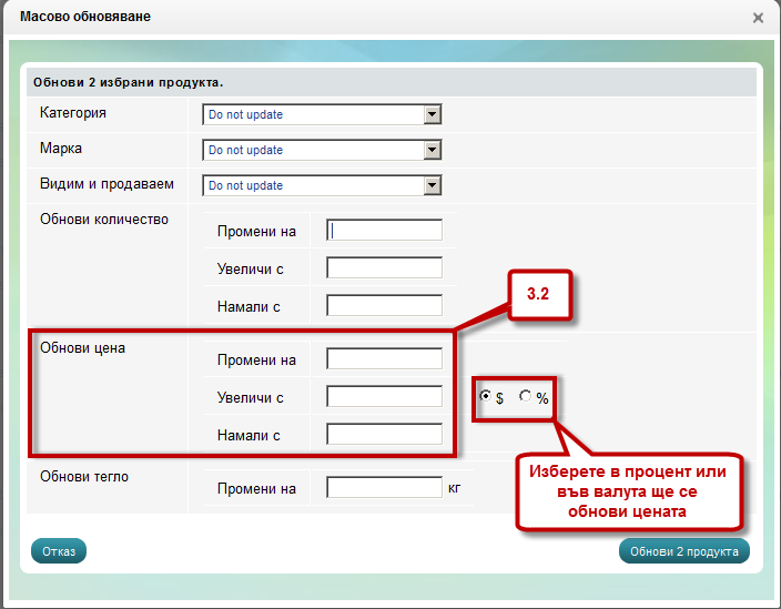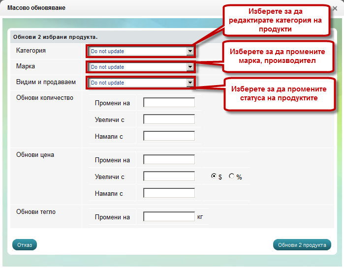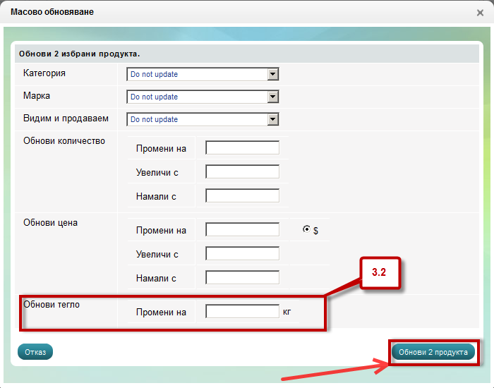 - Масовото обновяване от тук можете да промените, увеличите или намалите количеството, цената, теглото на избраните от Вас продукти: