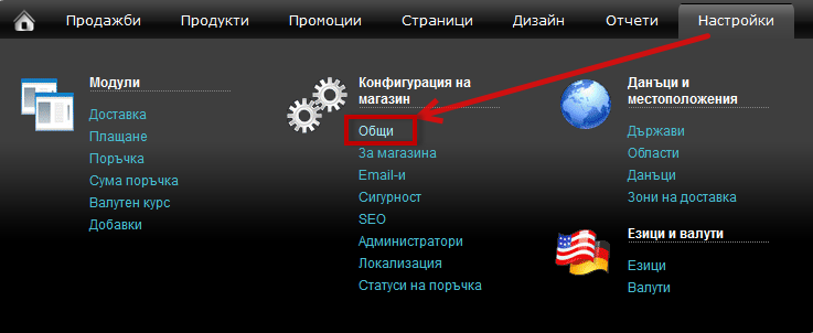 Отворете главното меню Натройки и кликнете на Общи под колоната конфигурирация на магазин.