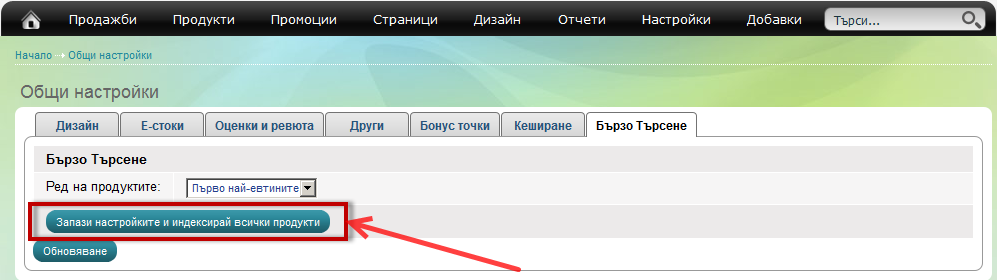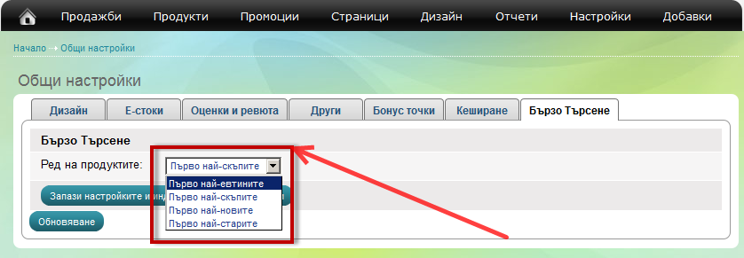 - От падащо меню, може да зададете в какъев ред да се индексират продуктите при търсене в клиентската област на магазина Ви.