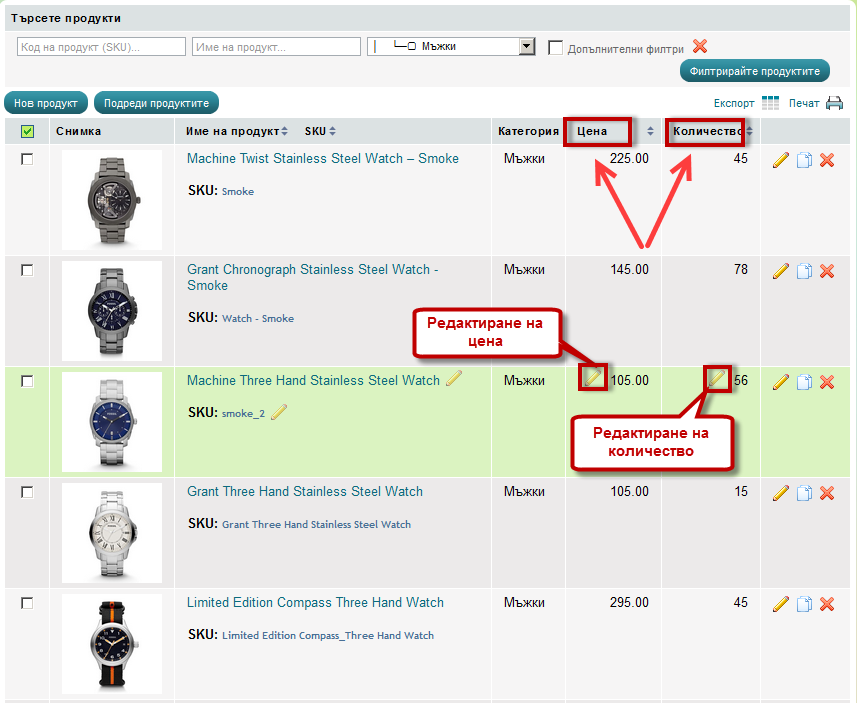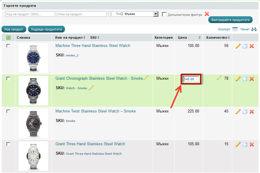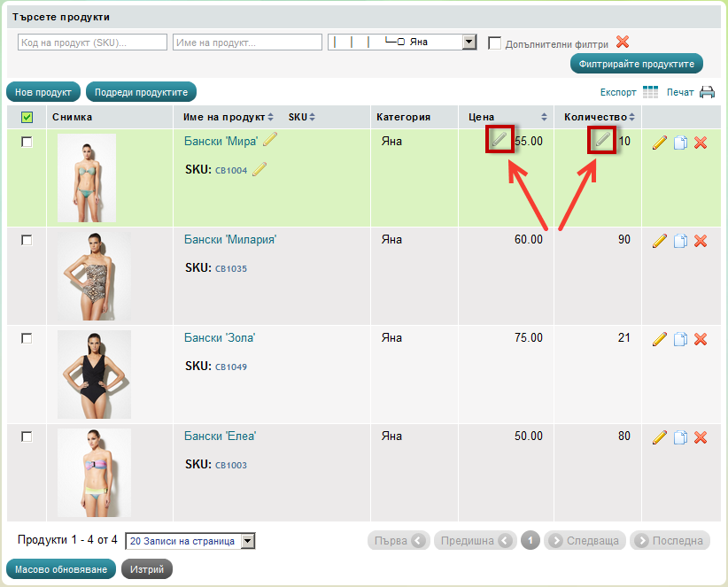 За по-бързо редактиране на цената и количеството на продуктите Вие можете да ги редактирате директно от списъка.