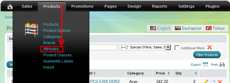 Отворете меню Продукти, кликнете върху линка атрибути: От менюто изберете атрибута, който искате да ...