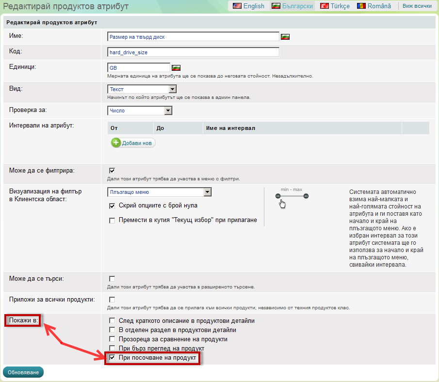 За да добавите атрибути към преглед При посочване на продукт, трябва да активирате самата функция от настройката на самия атрибут: