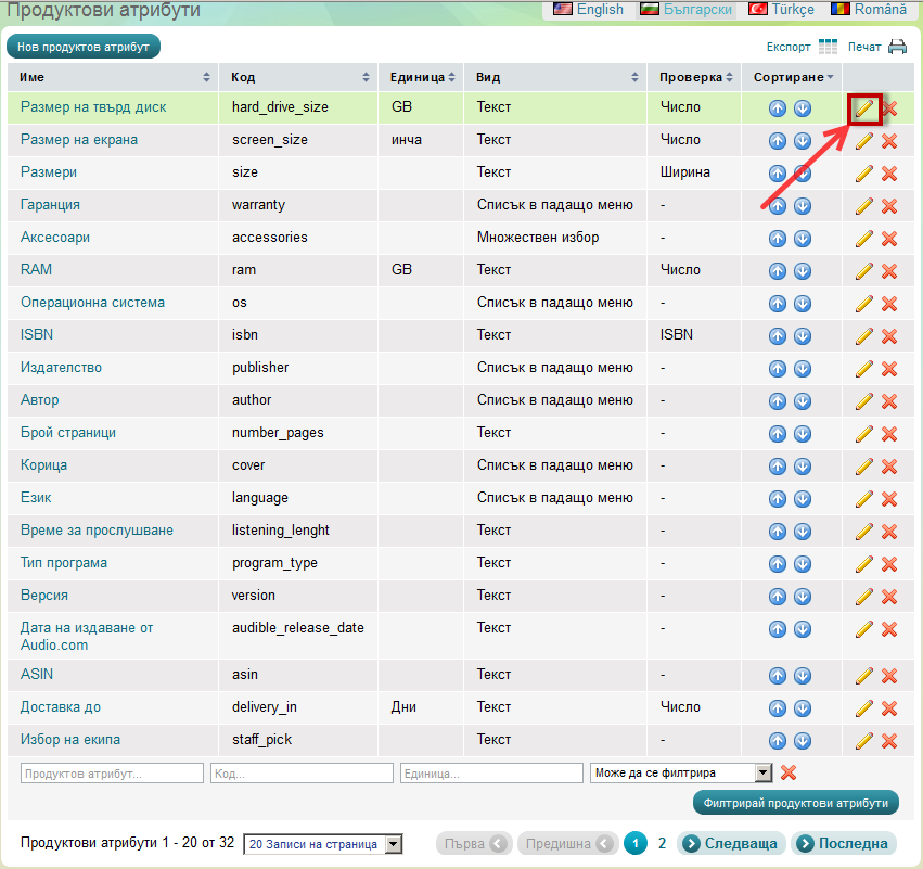 - Изберете атрибута, който искате да се вижда При посочване на продукт и кликнете na иконата за редактиране: