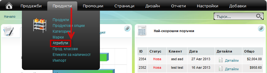 - Изберете от Продукти от главното меню и изберете Атрибути: