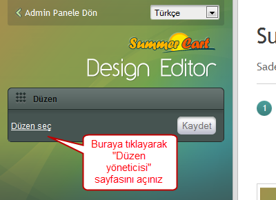 Tasarım editöründe ilk yapmanız şey düzen seçmek. Mağazanızda birçok sayfa bulunmakta ve genellikle çoğu sayfalar aynı düzendedir. "Düzen Seç" yazisina tıkladığınız zaman "Düzen yönetim" sayfası açılacaktır.
