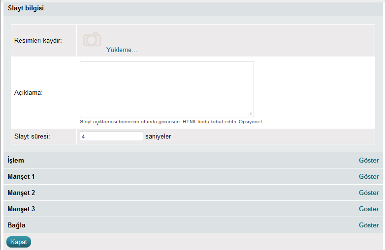 Slaytlar - buradan bannere resimleri ekleyebilirsiniz. "Yeni slayt ekle" ekle butonuna tıklayarak bannere resim ekleyebilirsiniz. Her resmin değiştirebileceğiniz birkaç ayarı vardır.