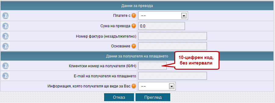 Изберете как ще платите. Въведете сумата, която трябва да преведете. Запишете в основание текста или номера, който сте получили в и-мейла. На КИН - въведете 10-цифрения уникален код, който сте получили, като е важно да се въведе без интервалите. Изберете информацията, която ще видиме за вас и натиснете "Преглед".