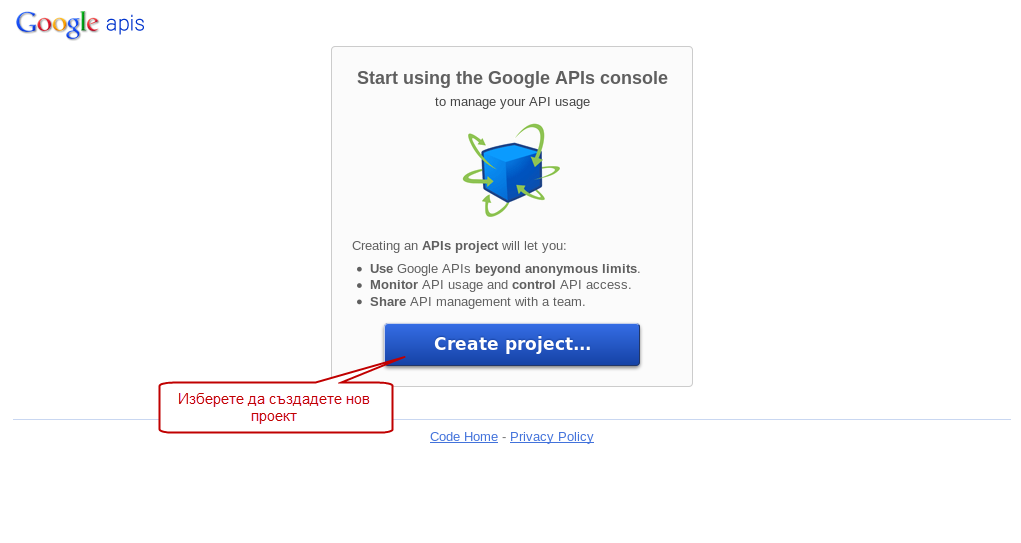 - Влезте с Вашият Google акаунт и натиснете бутона "Create Project..."