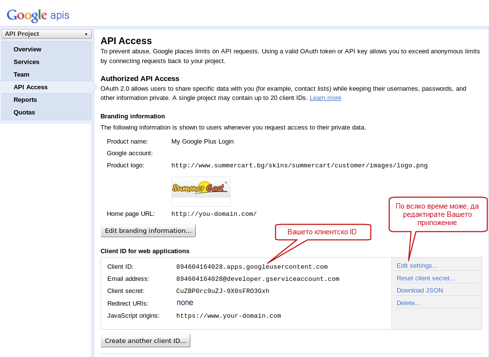 - След като активирате "Google+ API" от менюто влезте в "API Access" и натиснете бутона "Create an OAuth 2.0 client ID...", за да създадете Вашето клиентско ID.