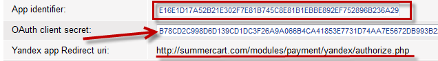 След като създадете приложението в Yandex.Money, ще видите детайлите за него, като трябва да копирате полетата App identifier и OAuth2 client_secret и да ги поставите на съответните места в Summer Cart модула. Проверете дали правилно сте въвели обратния URL в приложението. Трябва да е идентичен с този в Summer Cart.