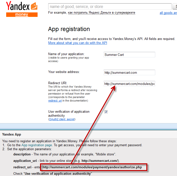 Ако все още не сте си създали приложение в Yandex.Money, последвайте линка от първата стъпка от настройките на модула в Summer Cart и въведете името на приложението, точния адрес на сайта и обратния URL. След това сложете отметка да използвате проверка за автентичността на приложението.