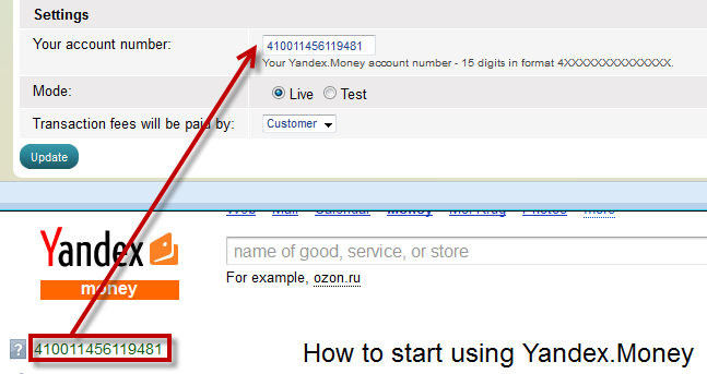 Въведете номера на акаунта си в Yandex (ще го намерите в горния ляв ъгъл в профила си в Yandex.Money). След това изберете дали модулът ще бъде в реална среда или само за тестване и изберете кой ще плати таксата за плащането - клиентът или вие. Най-накрая натиснете бутона за активиране.