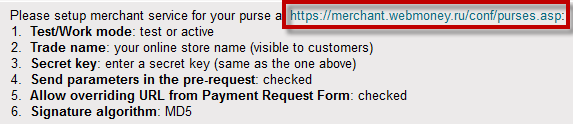 След като изпълните тези стъпки, се върнете в модула за плащане на Web Money в Summer Cart и въведете номера на т.нар. "purse", който може да видите най-горе при настройктие на "портфейла" в сайта на Web Money, като ще го познаете по това, че започва с главна буква, следвана от няколко цифри. След това въведете паролата, която сложихте в настройките в Web Money и изберете режима (test или active).