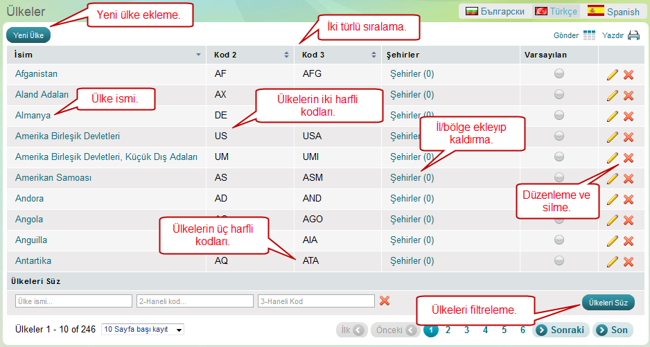 Ülkeler sayfası tüm ülkeleri içeriyor ve sizin ihtiyarçlarınıza göre düzenlenebilir. Ülkeler gönderim ve vergiler modüller için temel bileşenlerdir.