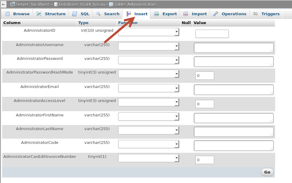 3. В страницата която се отваря в полето "AdministratorUsername" въвеждате потребителското име. В полето "AdministratorPassword" въвеждате паролата като обикновен текст. В полето "AdministratorPasswordHashMode" въвеждате стойността "0". След това в полето "AdministratorAccessLevel" въвеждате стойността 2. И след това натискате на бутона "Go"