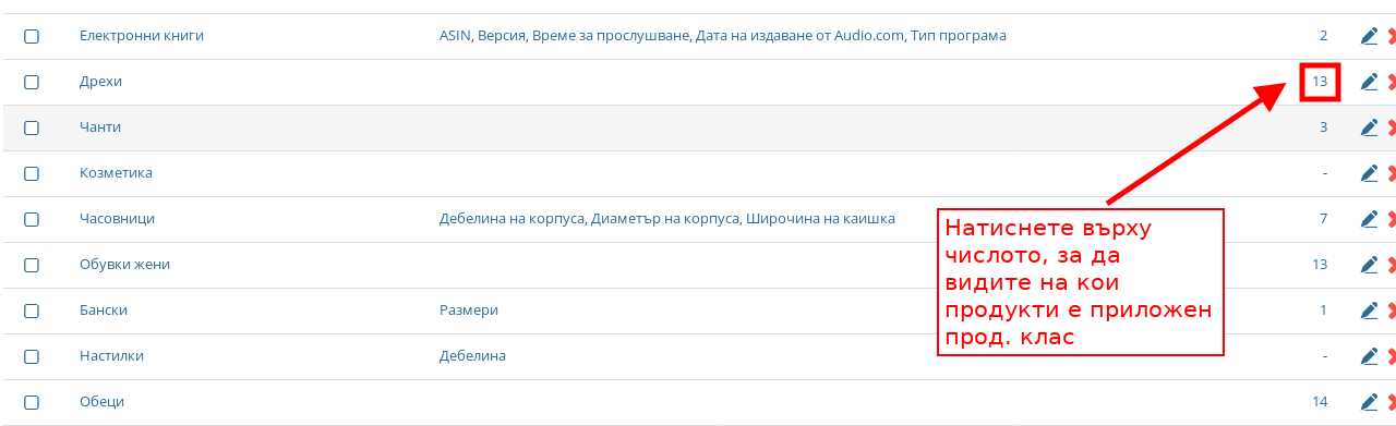 Важно: Ако избраните Продуктови класове са приложени върху някой продукт ще получите грешка при опит за изтриване. За да изтриете Продуктовия клас трябва той да не е приложен върху никой продукт. Ако не сте сигурни в кои продукти използвате Продуктовия клас, можете да проверите като натиснете числото под колоната “Продукти”.