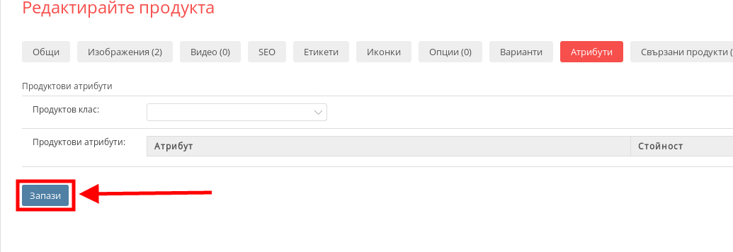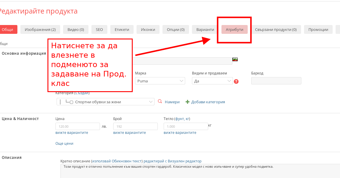 - След като сте вътре в продукта натиснете върху полето “Атрибути”.
