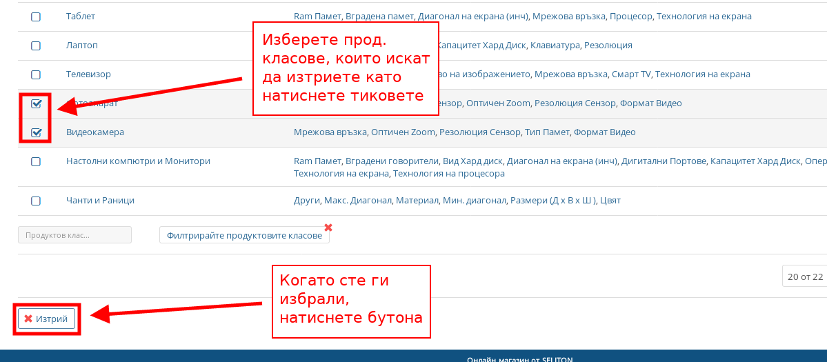 - Ако искате да изтриете повече от един Продуктов клас, сложете “тик” в квадрачетата до продуктовите класове, които желаете да изтриете и натиснете бутона “Изтрий”, намиращ се под менюто с Продуктови класове.