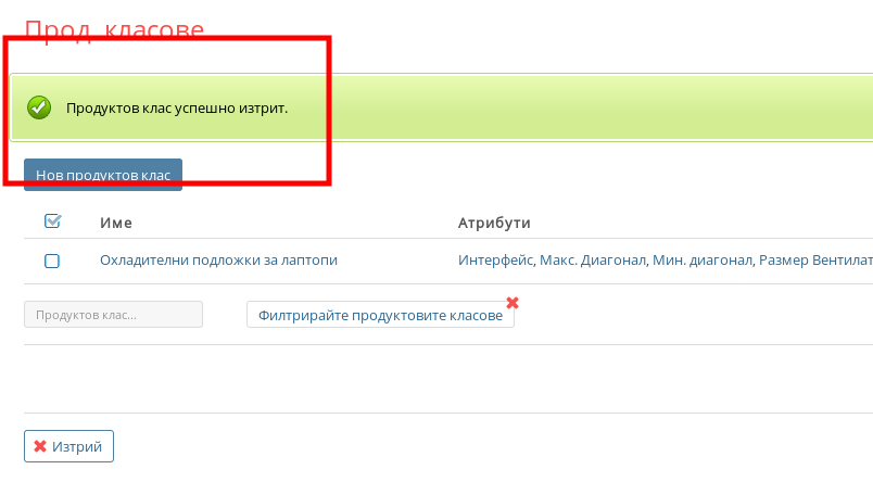 Когато изтриването на Продуктов клас е успешно ще се визуализира зелено поле с текст “Продуктов клас успешно изтрит”.