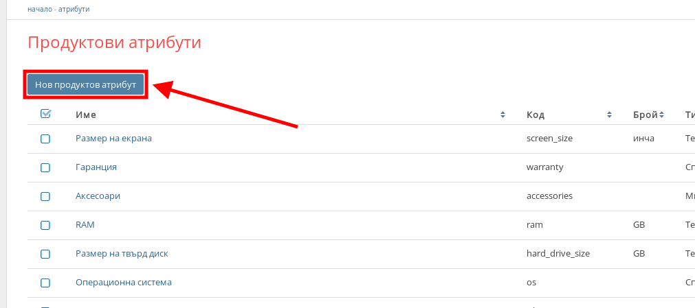 1. В меню Продукти, кликвате на колонката Атрибути