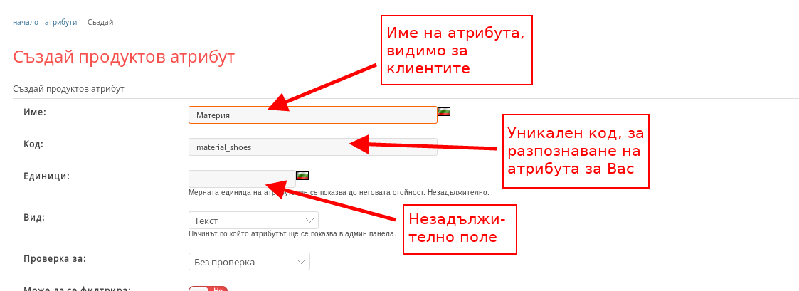 4. В поле  “Код” е добре да зададете уникално име на атрибута, с което да го намирате по-лесно в административната област (Пример: Ако имате 2 атрибута Материя, един за дрехи и един за обувки, единият да се казва “material_clothes” и другият “material_shoes”).