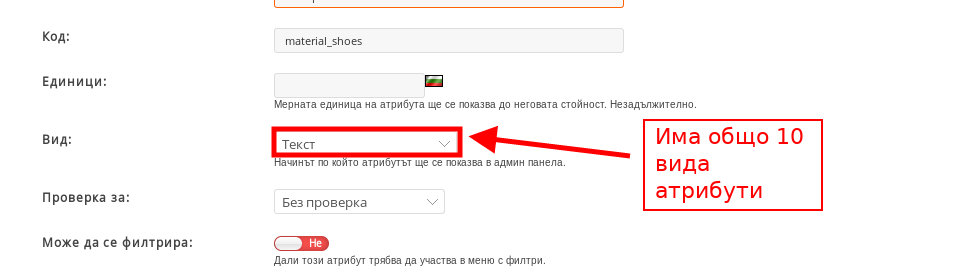 6. В поле “Вид” можете да изберете какъв вид Атрибут по-точно Ви трябва.