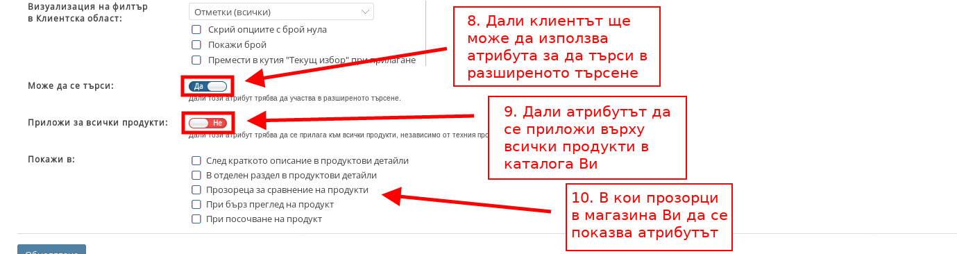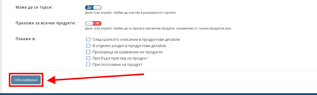 9. След това да избере дали атрибутът да се приложи върху всички продукти в каталога Ви – може да използвате тази настройка за Системните видове Атрибути.
