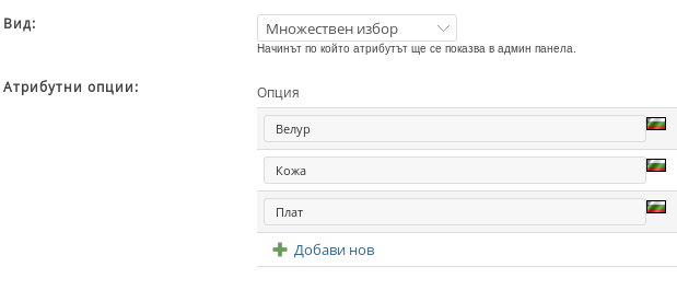 - Вид “Множествен избор” - за този вид атрибути трябва да бъдат въведени “Атрибутни опции”, като всяка опция ще е нов бутон под формата на checkbox, на който да може да се сложи отметка.