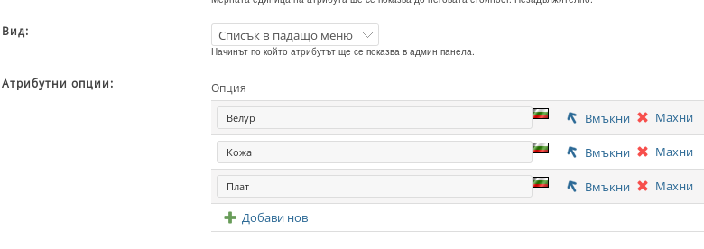 - Вид “Списък в падащо меню” - за този вид атрибути трябва да бъдат въведени “Атрибутни опции”, като всяка опция ще е нов избор в падащото меню
