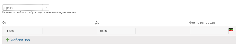 - Вид “Цена” - за този вид атрибути можете да добавите ценови интервали, чрез които продуктите да се филтрират, като опциите “От” - “До” са числови стойности, а името може да е под формата на текст.