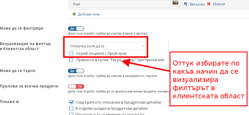 - Вид “Отметка” - за този Атрибут няма допълнителни опции, като той може да бъде маркиран към даден продукт чрез отметка.