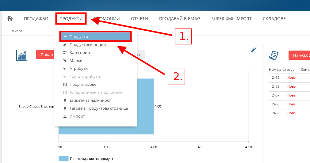 - Първо в меню Продукти натиснете върху подменюто със същото име – "Продукти".