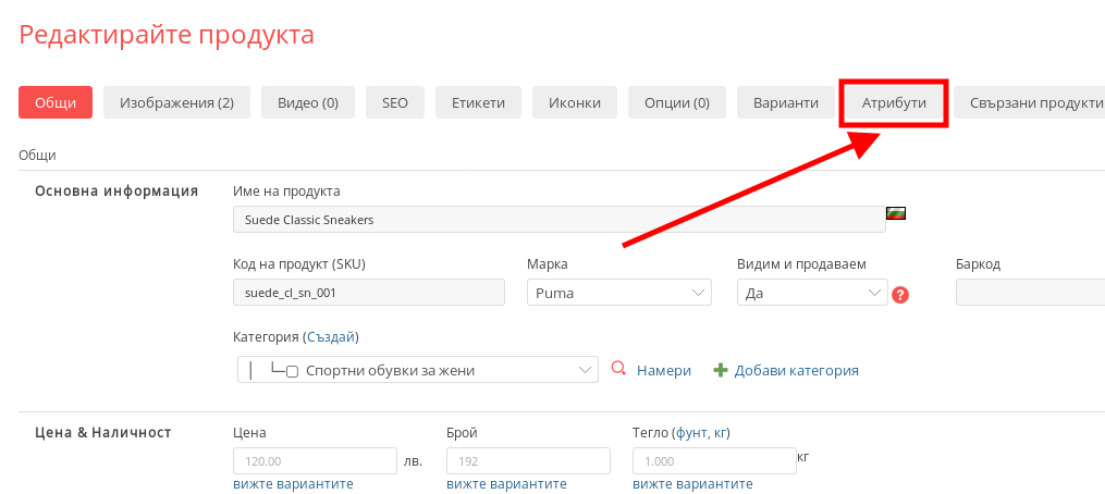 - След като сте влезнали в настройките на продукта натиснете върху бутона “Атрибути”.