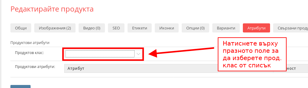 За да приложите Атрибутите върху желания от вас продукт първо трябва да му зададете Продуктовия клас, в който те се съдържат: