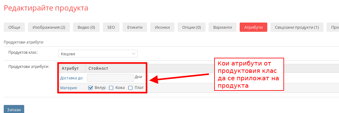 - Сега ще се визуализират Атрибутите, които са добавени към въпросния Продуктов клас и ще можете да изберете кои атрибути да приложите. Полетата, които оставите празни няма да се визуализират в Клиентската област.