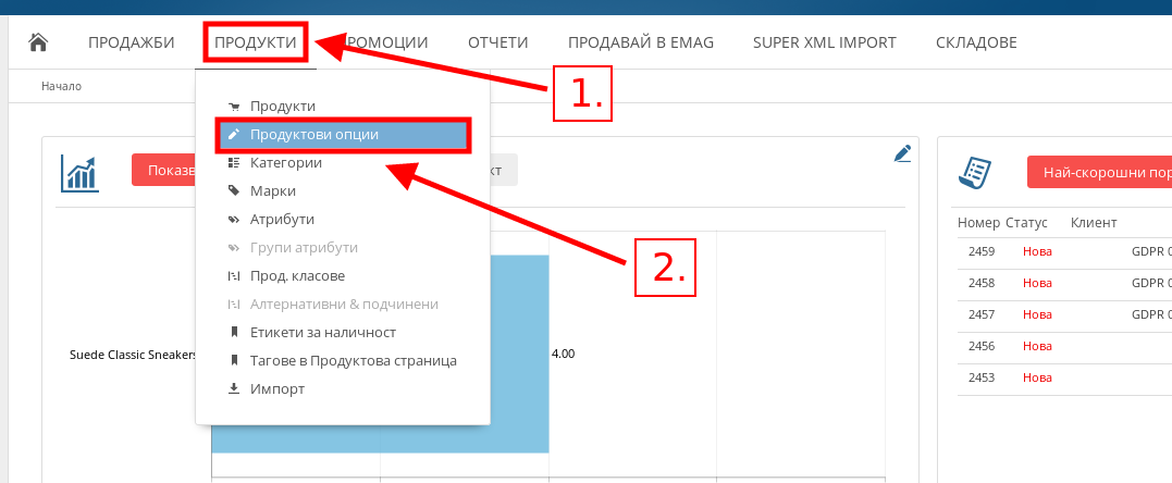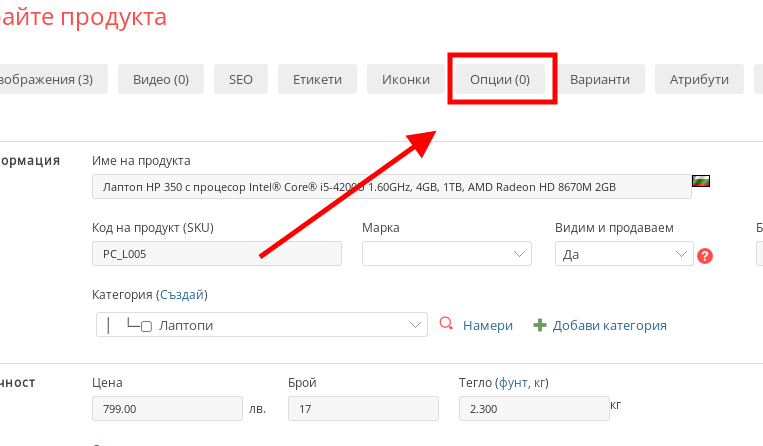 - В меню продукти натиснете върху подменюто “Продуктови опции”.