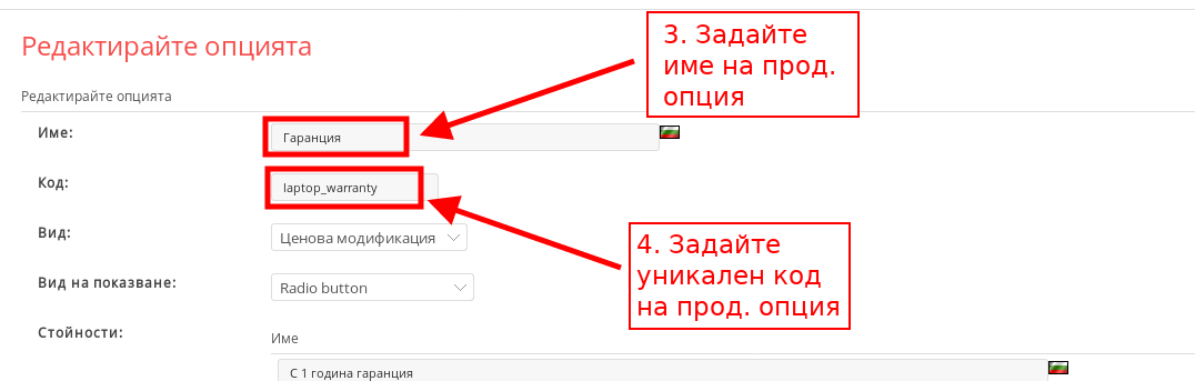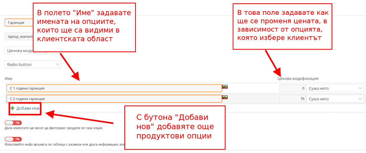 - Следващата стъпка е да попълните параметрите за всяка опция. За целта ще използваме по-горния пример с техника и различните гаранционни периоди. Можете да добавяте продуктови опции чрез бутона “Добави нов’. След като добавите желания брой полета е време да настроите стойностите на всяка опция: