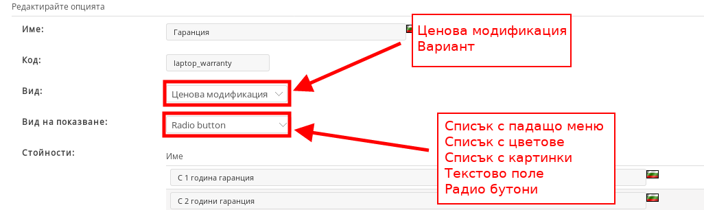 - “Ценова модификация” e oпция, която променя цената на продукта – примерно лаптоп с 2 години гаранция е със 79 лв. по-скъп от лаптоп с 1 година гаранция;