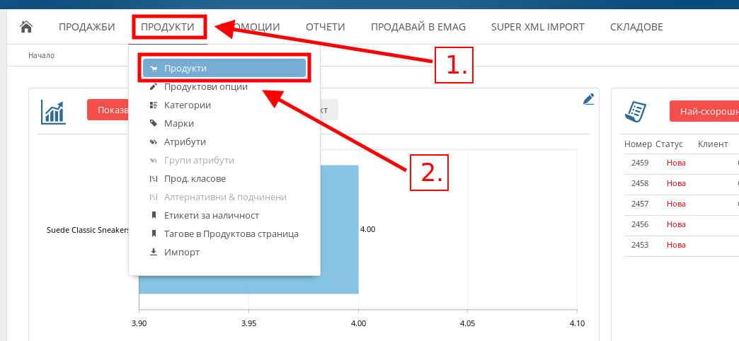 - Отидете в меню Продукти и натиснете върху подменюто със същото име – "Продукти".