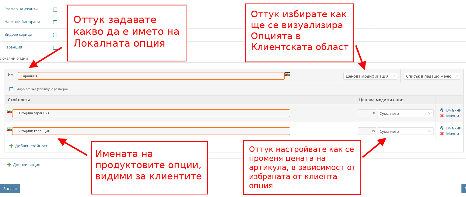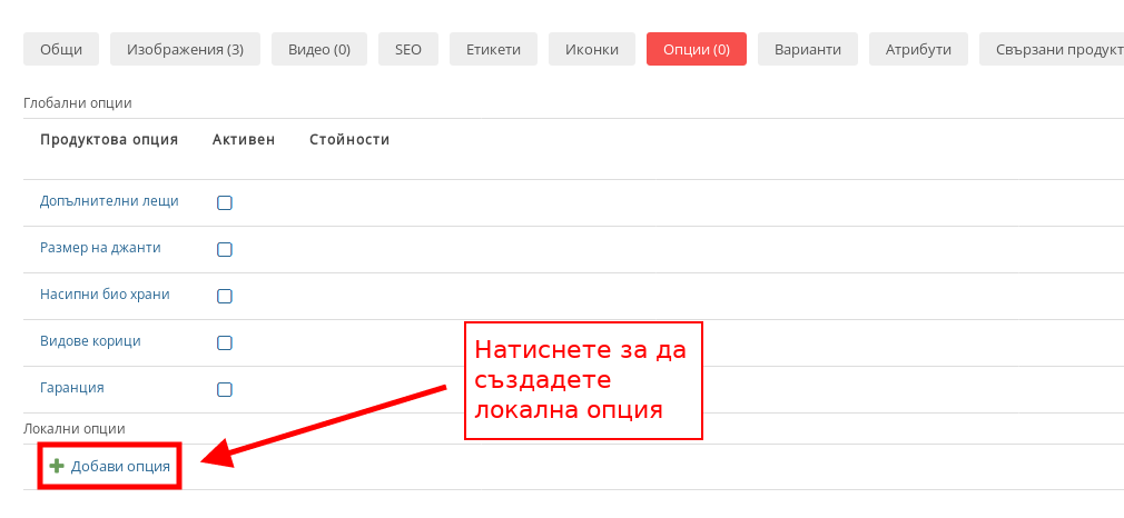 - Под списъка с Глобални опции има списък с Локални опции, в който можете да създавате Опции като натиснете бутона “Добави опция”.