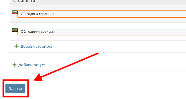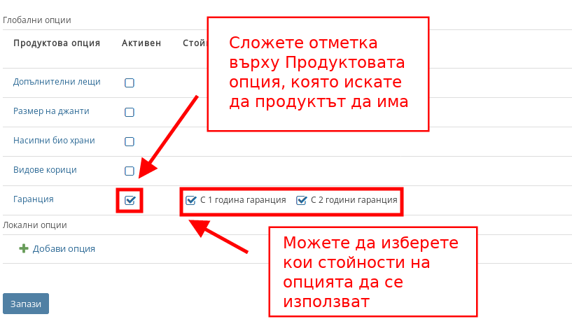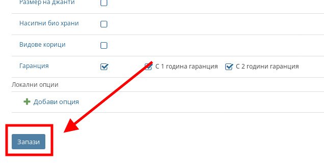 След като сте сложили отметки на желаната от вас Продуктова опция и нейни стойности, натиснете “Запази” и Продуктовата опция вече ще е приложена върху желания от Вас продукт.
