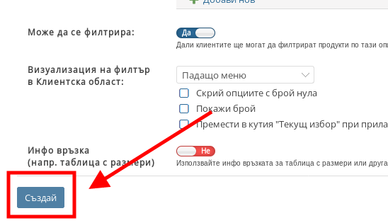Когато сте готови с настройките на Продуктовата опция натиснете бутона “Създай”.