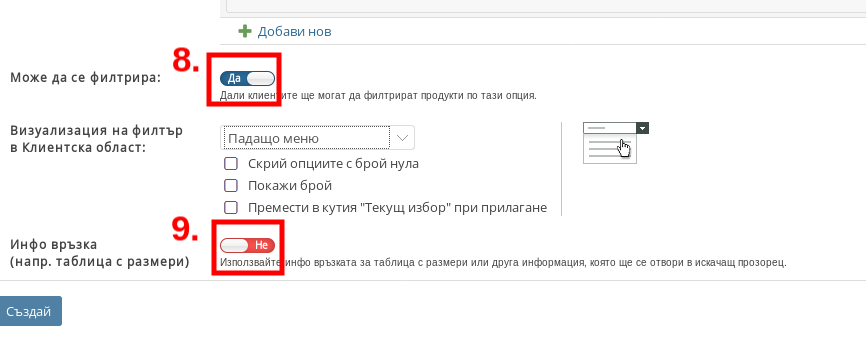 - С настройката “Може да се филтрира” задавате дали Продуктовите опции ще могат да се филтрират. Ако изберете “Да” ще получите и допълнителни настройки, с които да контролирате как се визуализират филтрите в Клиентската област.