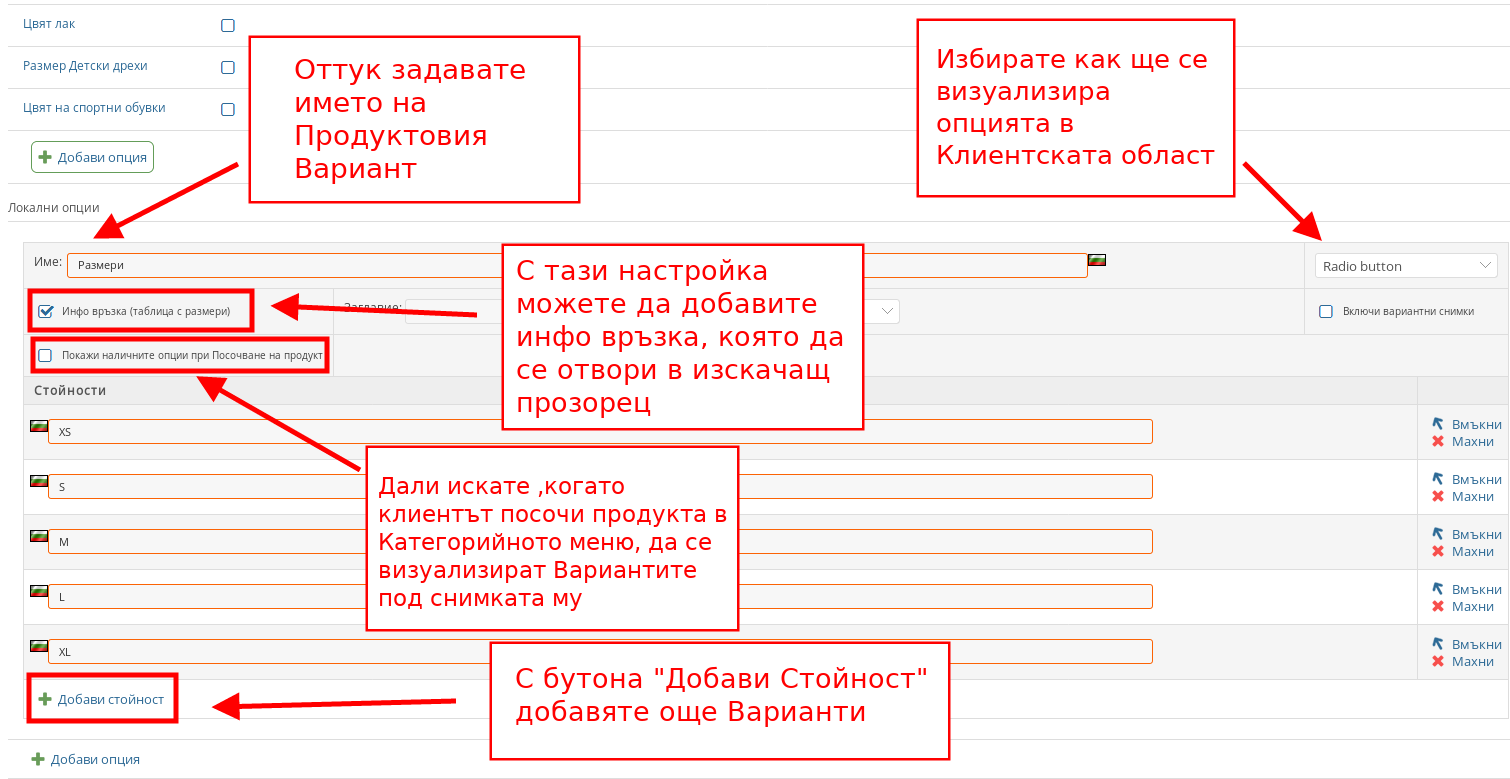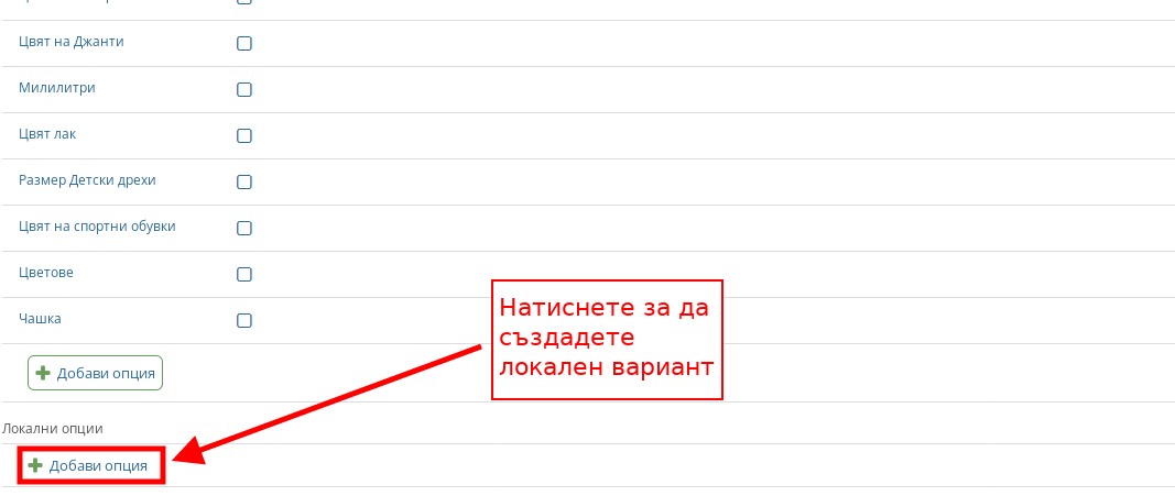 - Под списъка с Глобални Варианти има списък наименован "Локални опции", в който можете да създадете Вариант като натиснете бутона “Добави опция”.