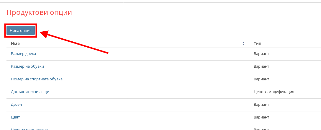 - В меню Продукти натиснете върху подменю “Продуктови опции”.