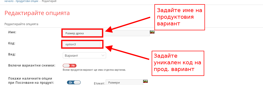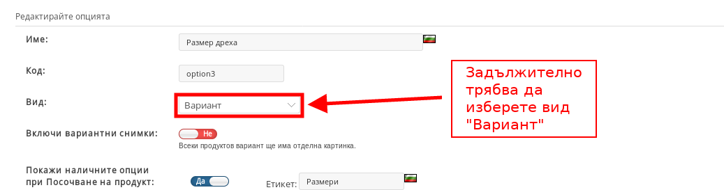 - В поле “Вид” е задължително да зададете “Вариант”. Продуктовата опция “Вариант” има и специфични за нея настройки.