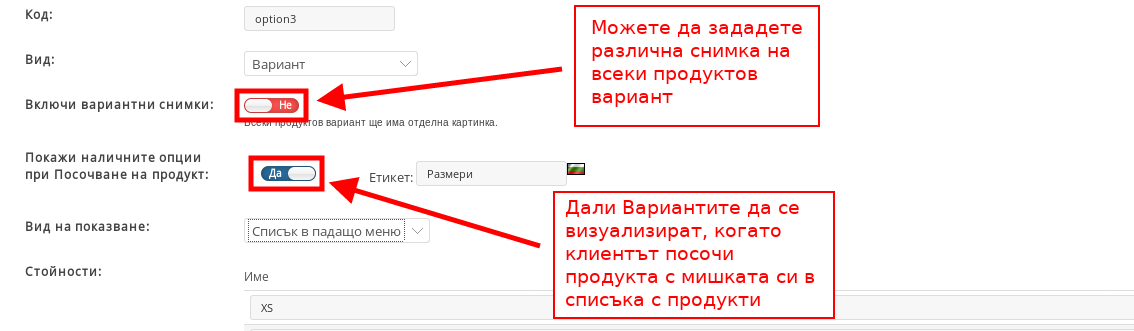 4.1 “Включи вариантни снимки” - всеки продуктов вариант може да има различна снимка. Подходящо, ако имате различни цветове от всеки продуктов вариант, които искате да покажете.